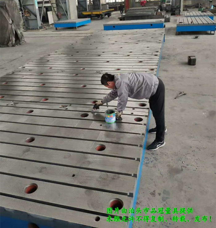 大型裝配平臺主要應用于動力機械設備的裝配和調試的鑄鐵工作臺,在裝配平臺正面加工有T形槽,可以固定動力機械設備,裝配平臺工作面上根據要求可加工圓孔、U型孔或長孔。